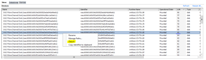 10. We will now perform a detach of LUN 65 using the vSphere Client.